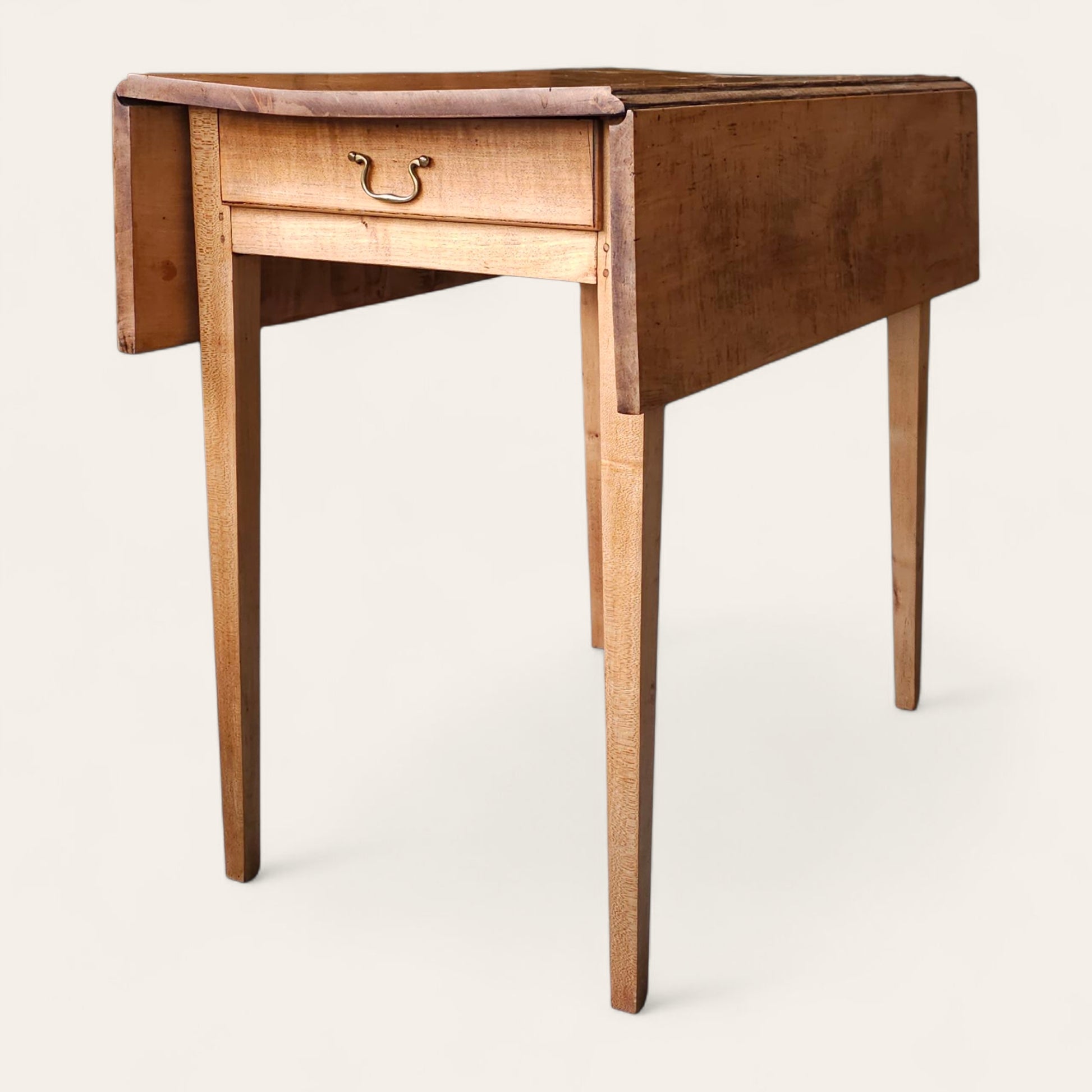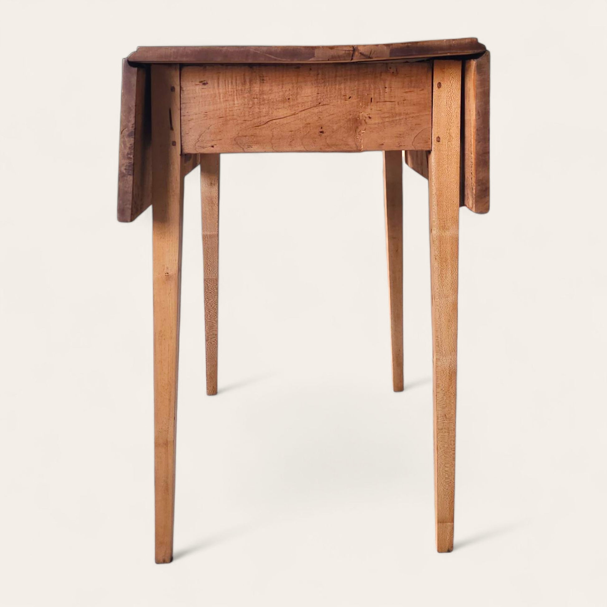 Late 18th-century New England craftsmanship is captured in this finely proportioned Pembroke table, attributed to a New Bedford cabinetmaker, circa 1790–1800. Constructed of beautifully figured maple with a single drawer and tapered legs, the table embodies the restrained elegance of the Federal period. The gently warped top speaks to its age and authenticity.