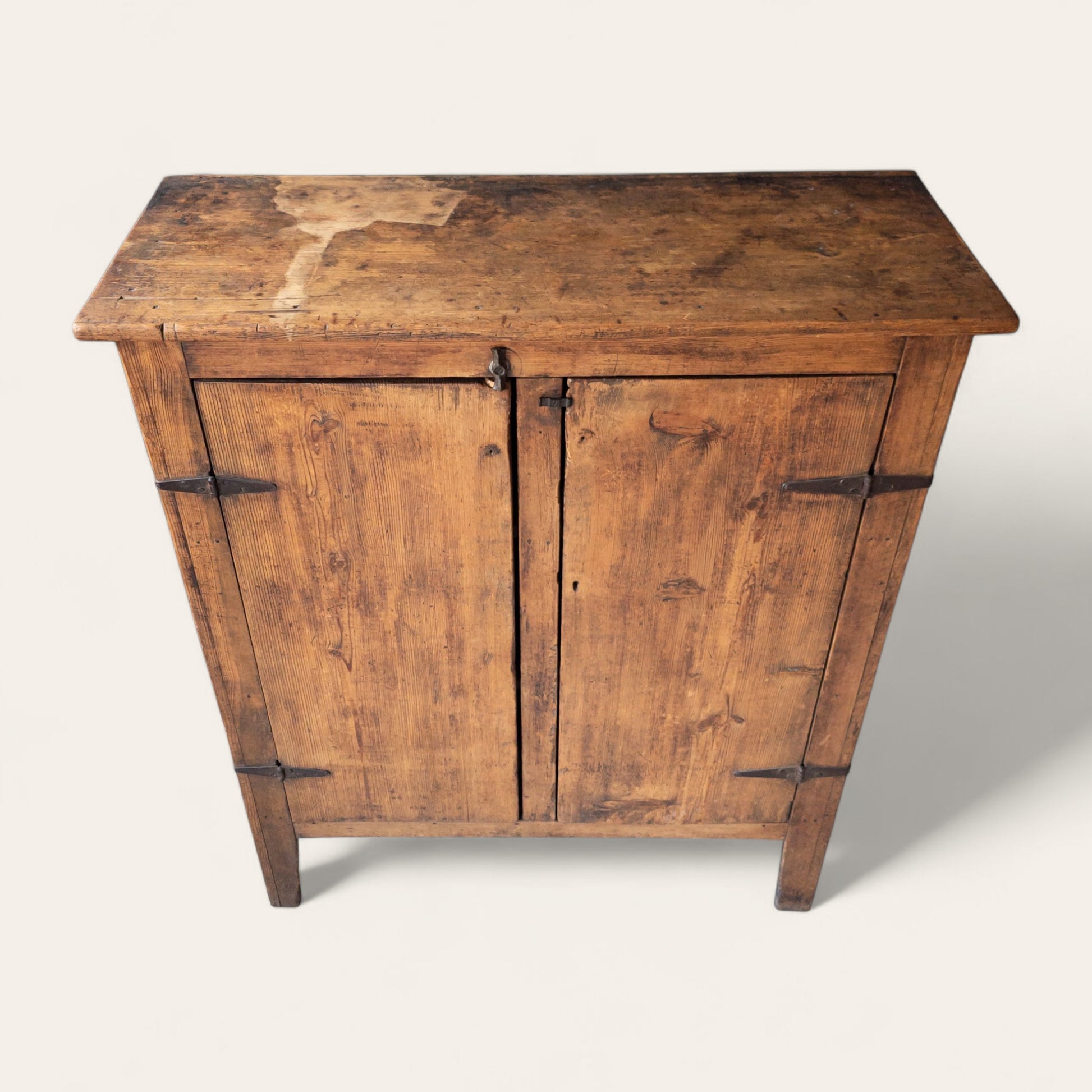 A warm and character-rich American pine cupboard, estimated from the mid-19th century, retaining the simplicity and functional clarity of early rural craftsmanship. The form is built in straightforward plank construction with surface-mounted strap hinges and a mellow, naturally aged finish that reflects generations of use.