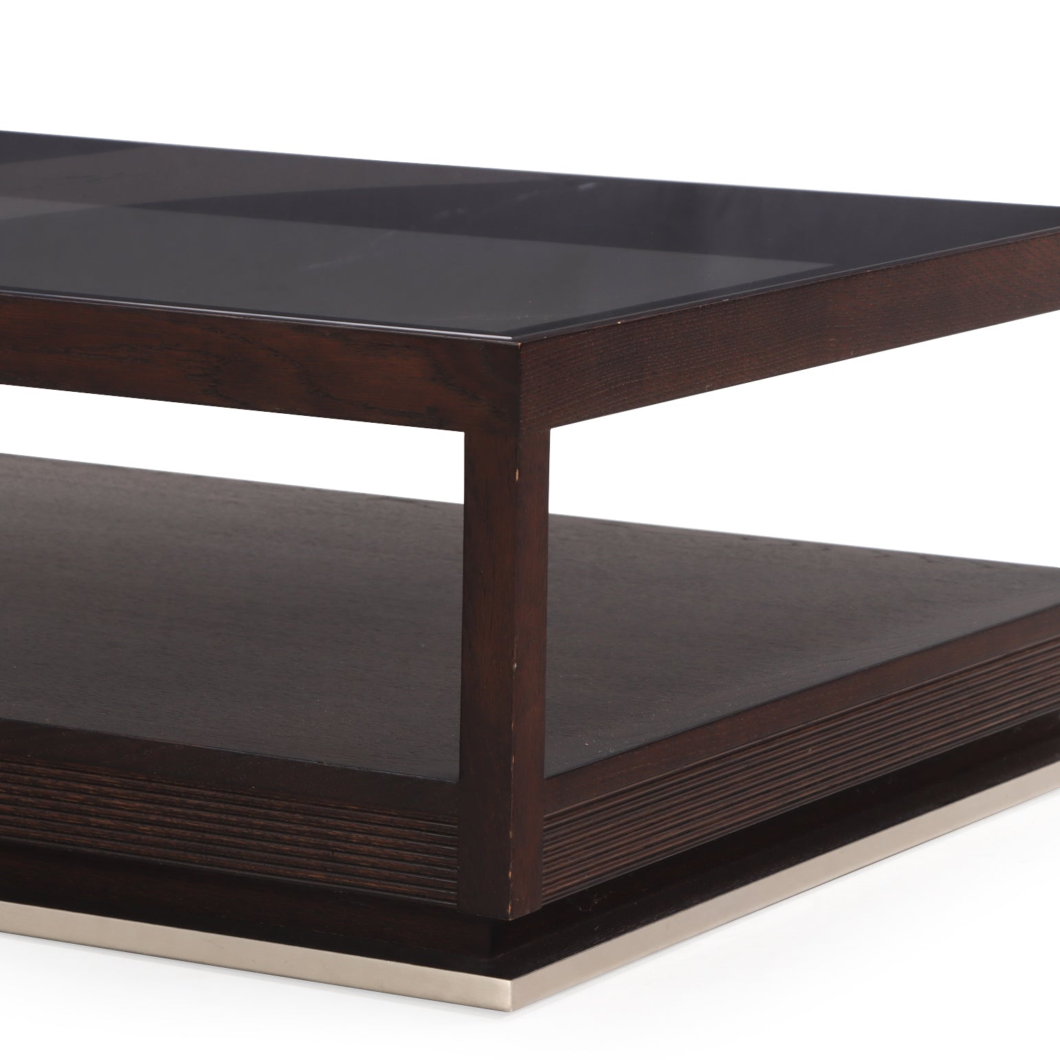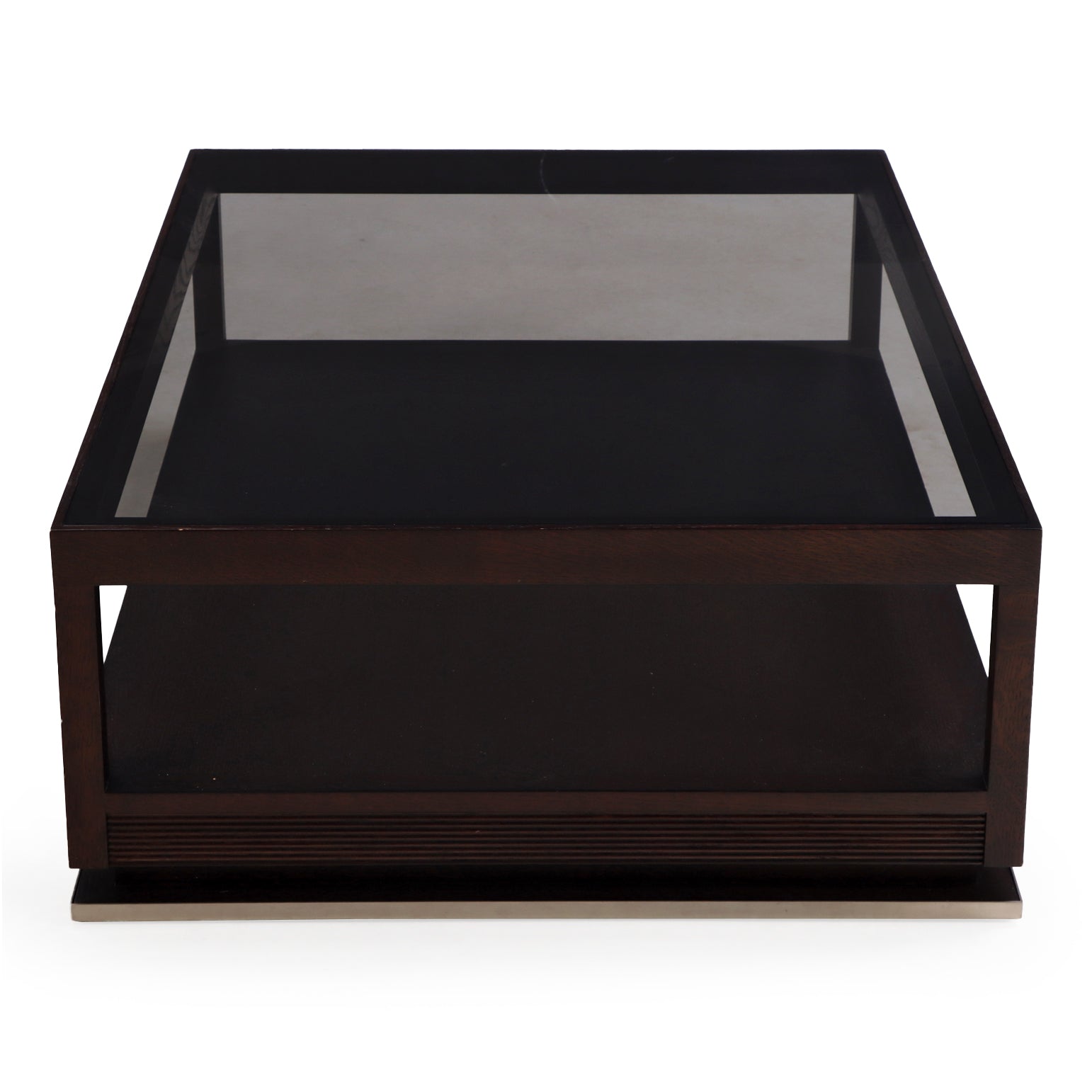 A refined contemporary coffee table attributed to Minotti. The design pairs a sleek smoked glass top with a streamlined espresso-stained wood frame. The rectilinear form emphasizes architectural purity, while the generously scaled surface offers both presence and function.
