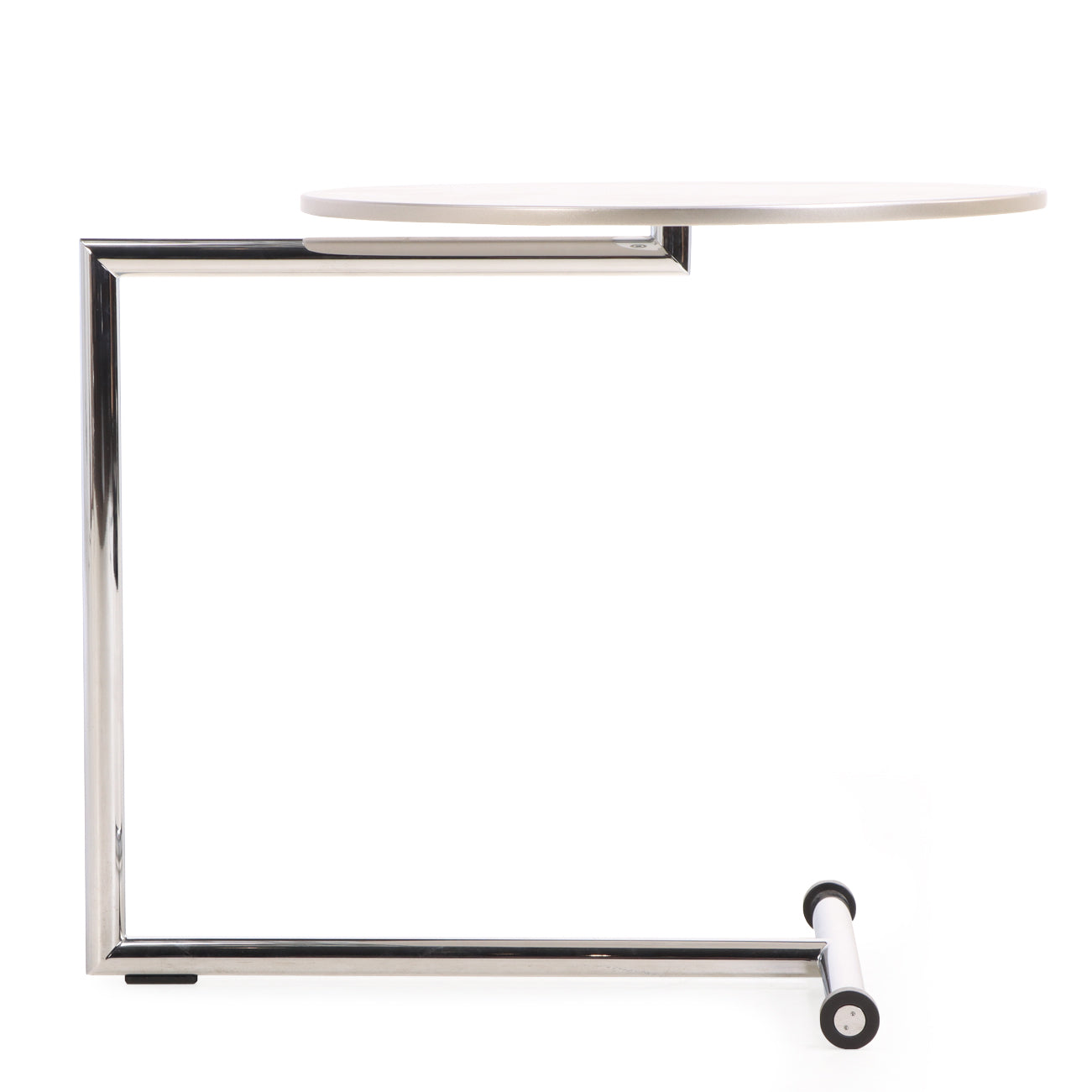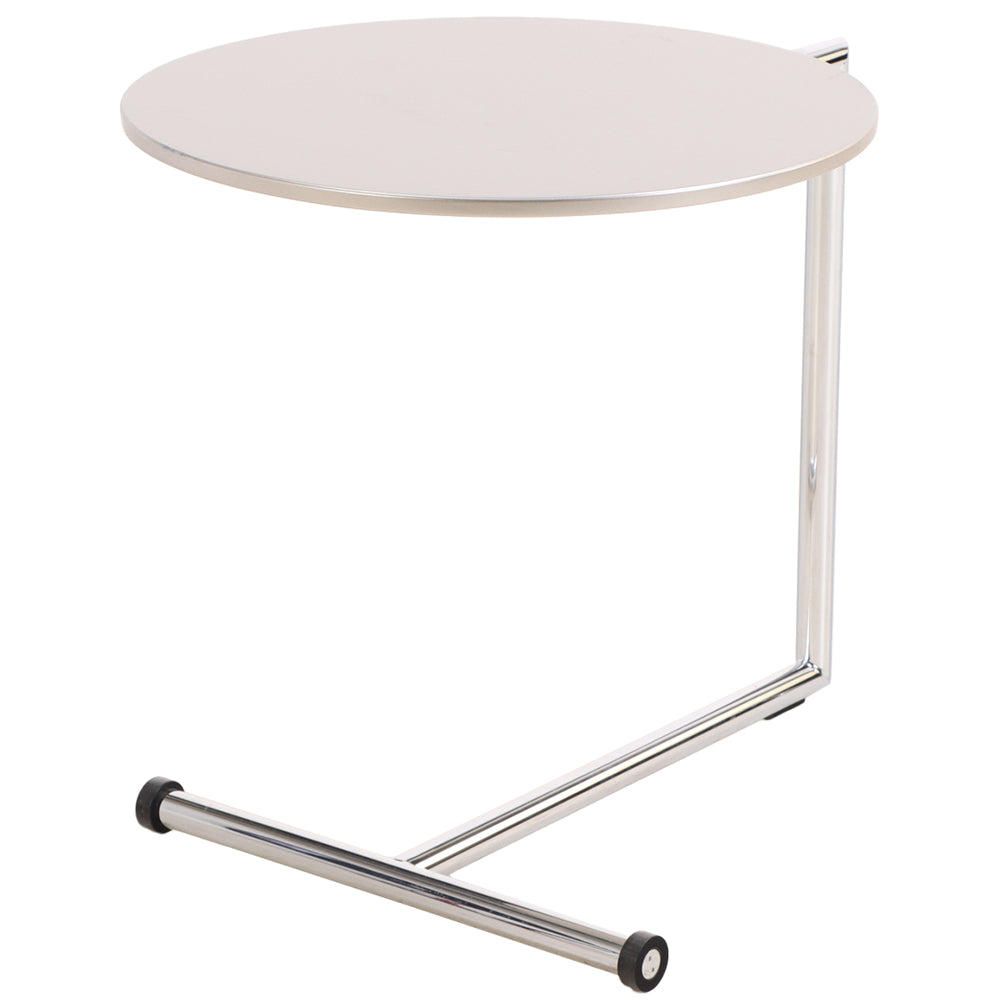 A contemporary modernist cantilever side table with a circular laminate top set on a polished chrome base. The geometric frame is designed for both clarity and function, allowing the top to extend neatly over the arm of a sofa or lounge chair.