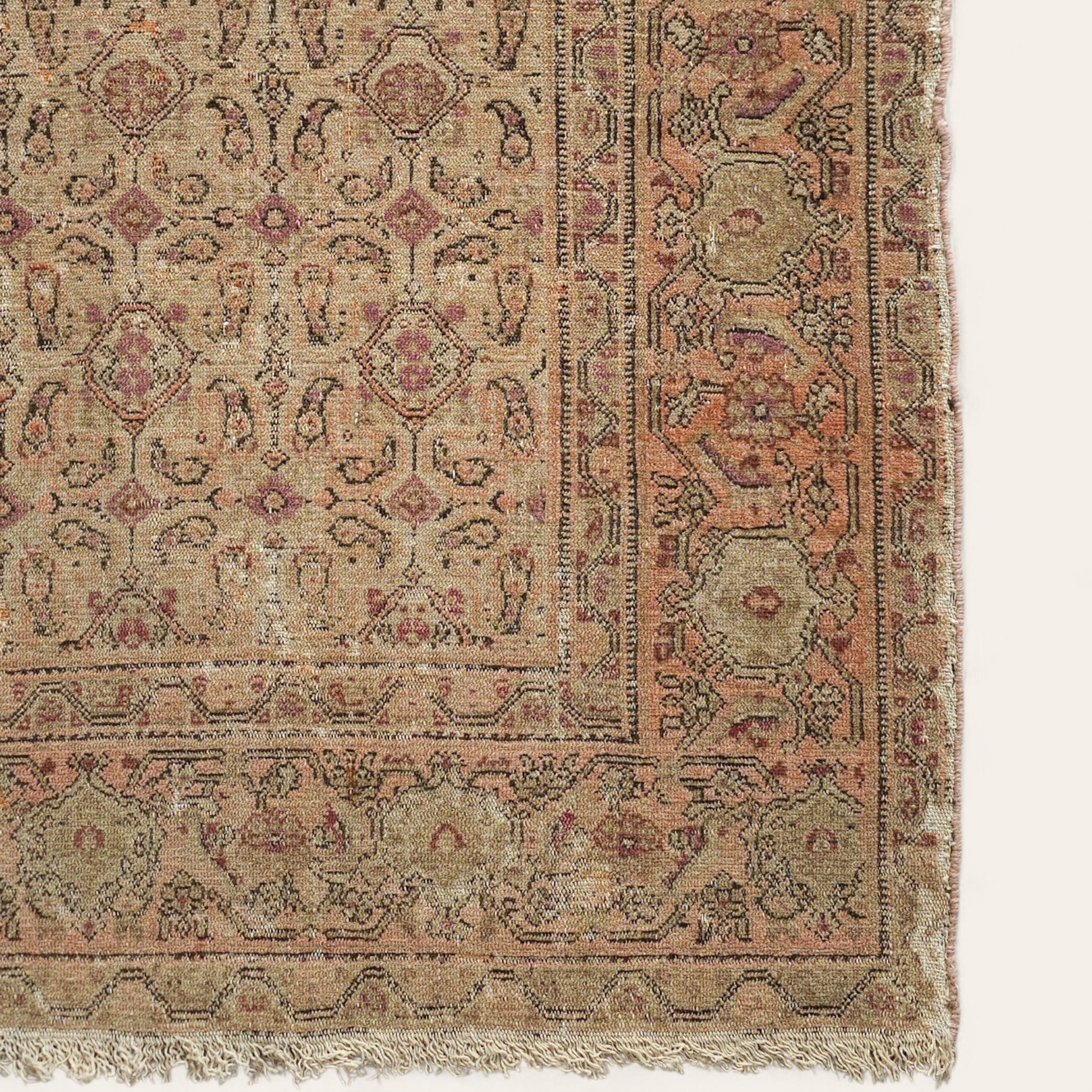 An early 20th century Persian rug with an allover repeating boteh‑style and floral lattice motif, framed by a traditional multi‑band border. The field shows softly faded rose, muted mauve, warm brown, and terracotta, with charcoal outlining that gives the pattern quiet definition despite the rug’s worn surface.