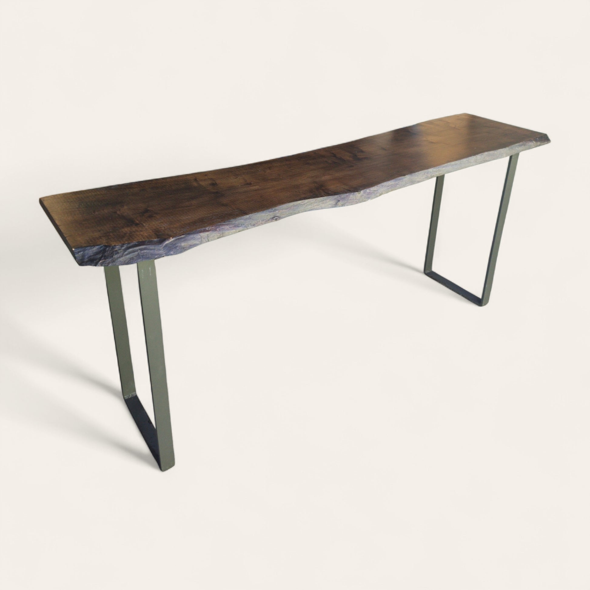 An oversized contemporary console table crafted from a spalted maple slab salvaged from a historic shipyard along Rondout Creek in New York’s Hudson Valley. The richly figured maple top is finished in a deep, dark tone that brings out the dramatic spalting, grain movement, and natural edge character inherent to the reclaimed timber. The scale is expansive and deliberate, offering a strong architectural presence suited to larger interiors.