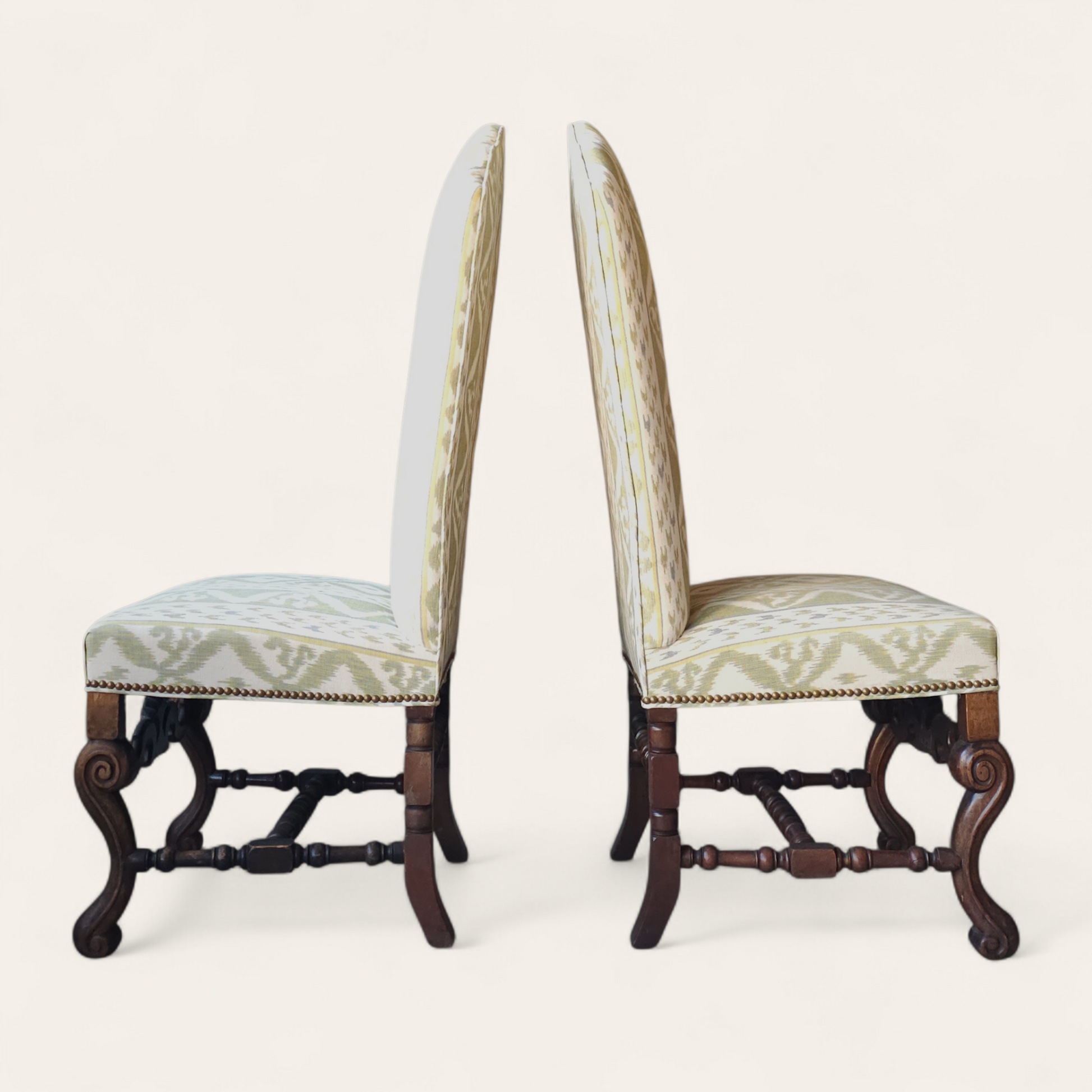 A striking pair of early–mid 20th century Flemish-style side chairs, crafted in walnut with the quiet authority typical of Northern European Baroque revival work. Each chair features a tall, arched back with sculptural presence, supported by robust block-and-turned legs joined by shaped cross-stretchers—an architectural silhouette that conveys both elegance and durability.