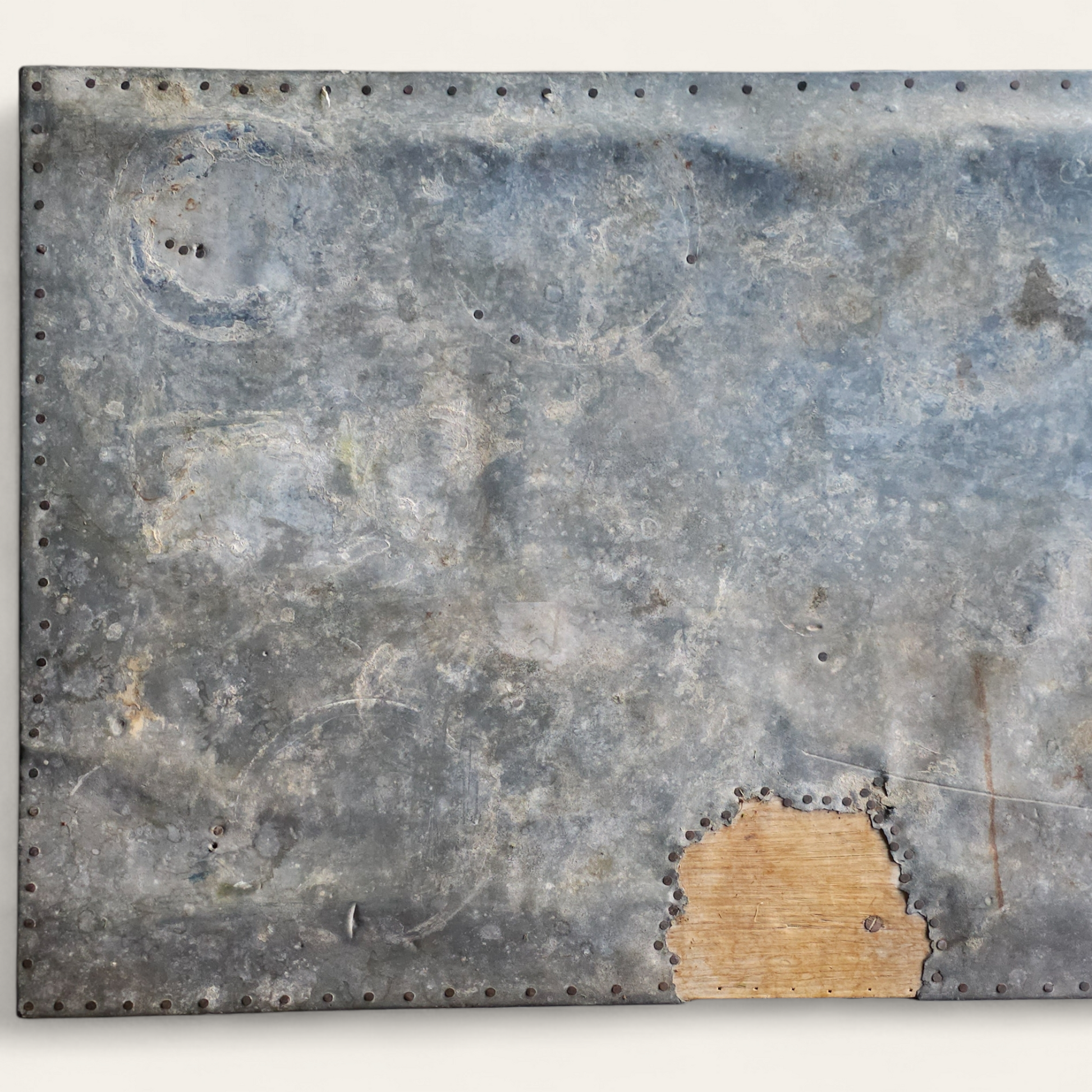 Stable condition with age-appropriate wear throughout. The zinc top shows notable patina, discoloration, dents, surface markings, and an area of loss revealing the wood beneath—consistent with decades of use. Painted wood base exhibits wear, scattered losses, and surface variation, all contributing to the character of the piece.